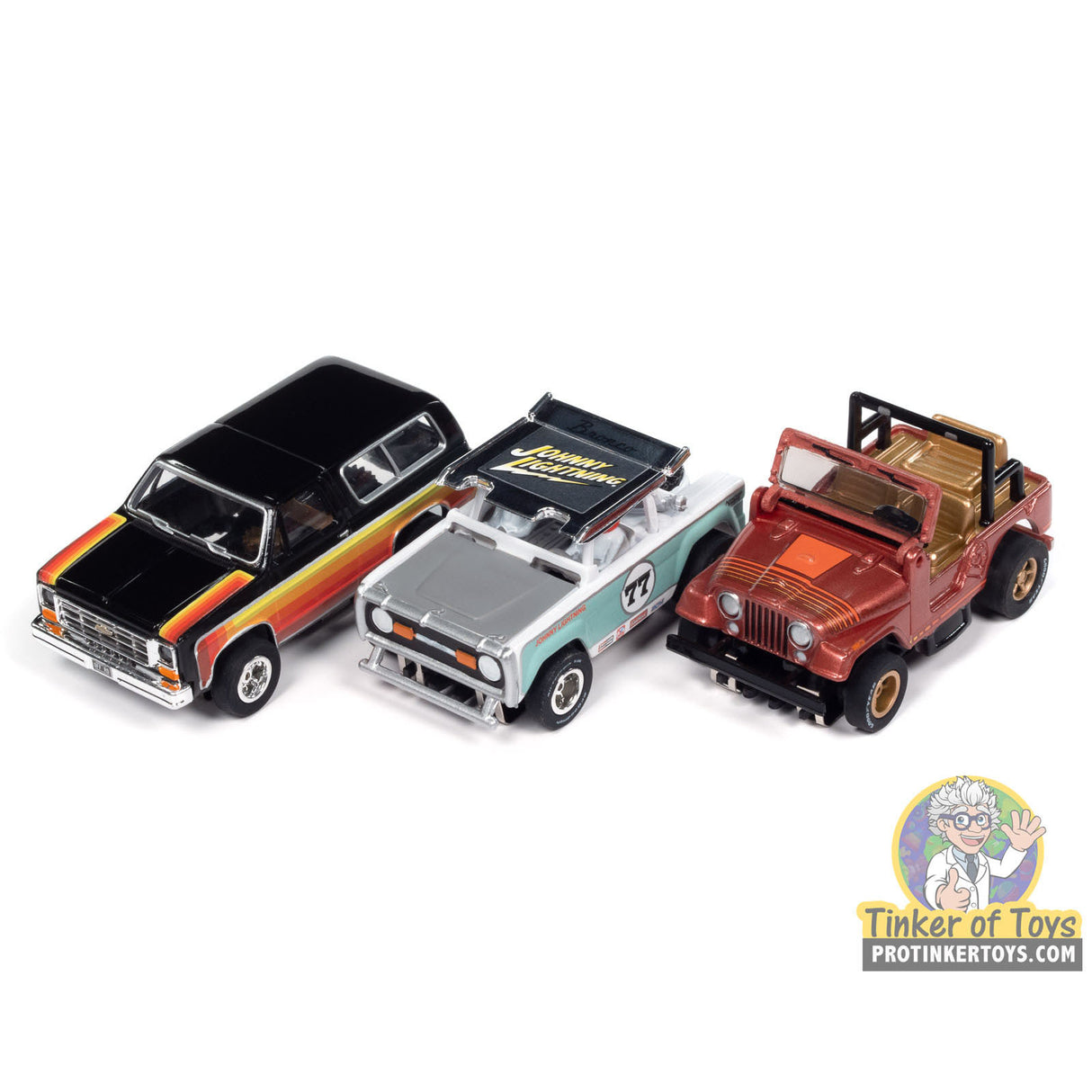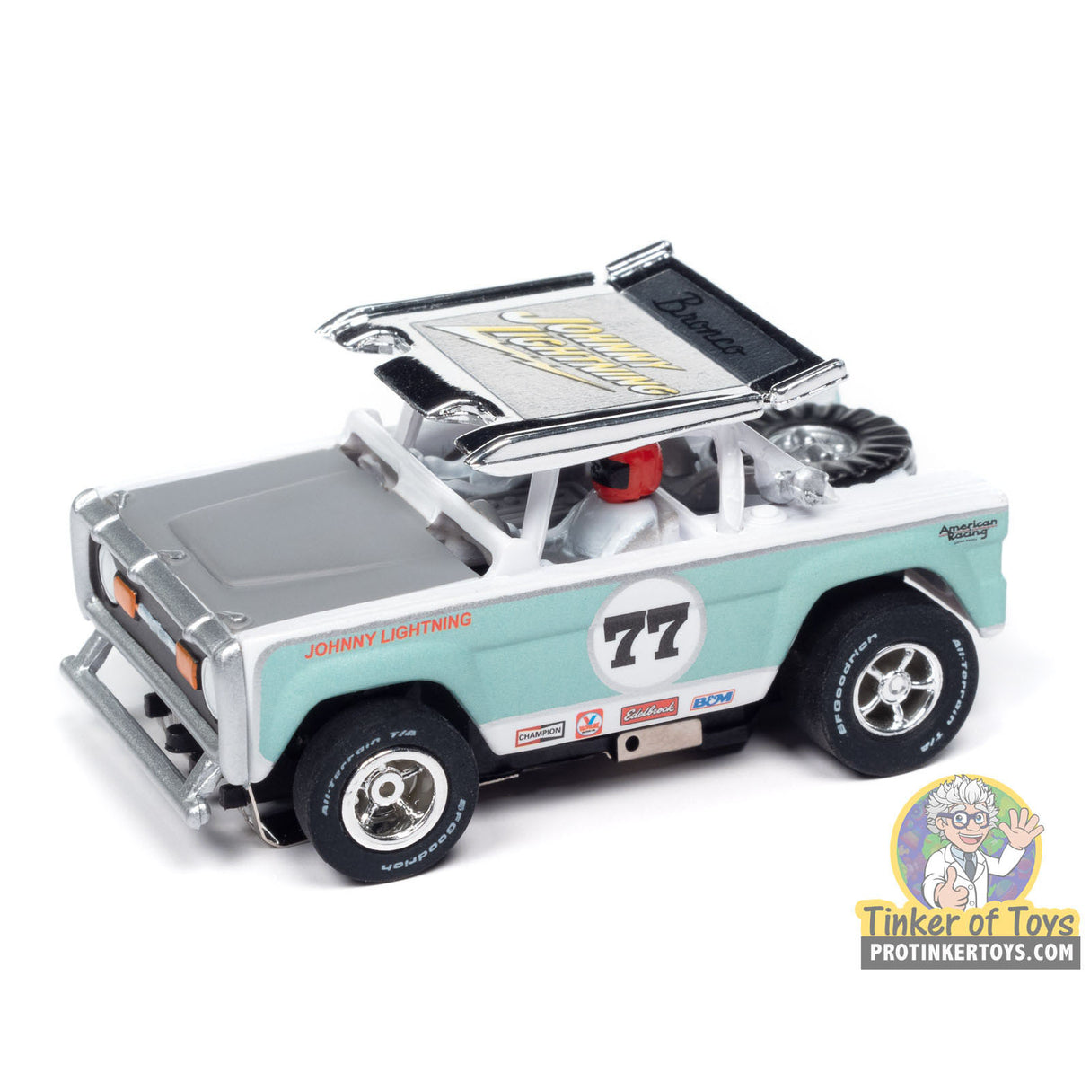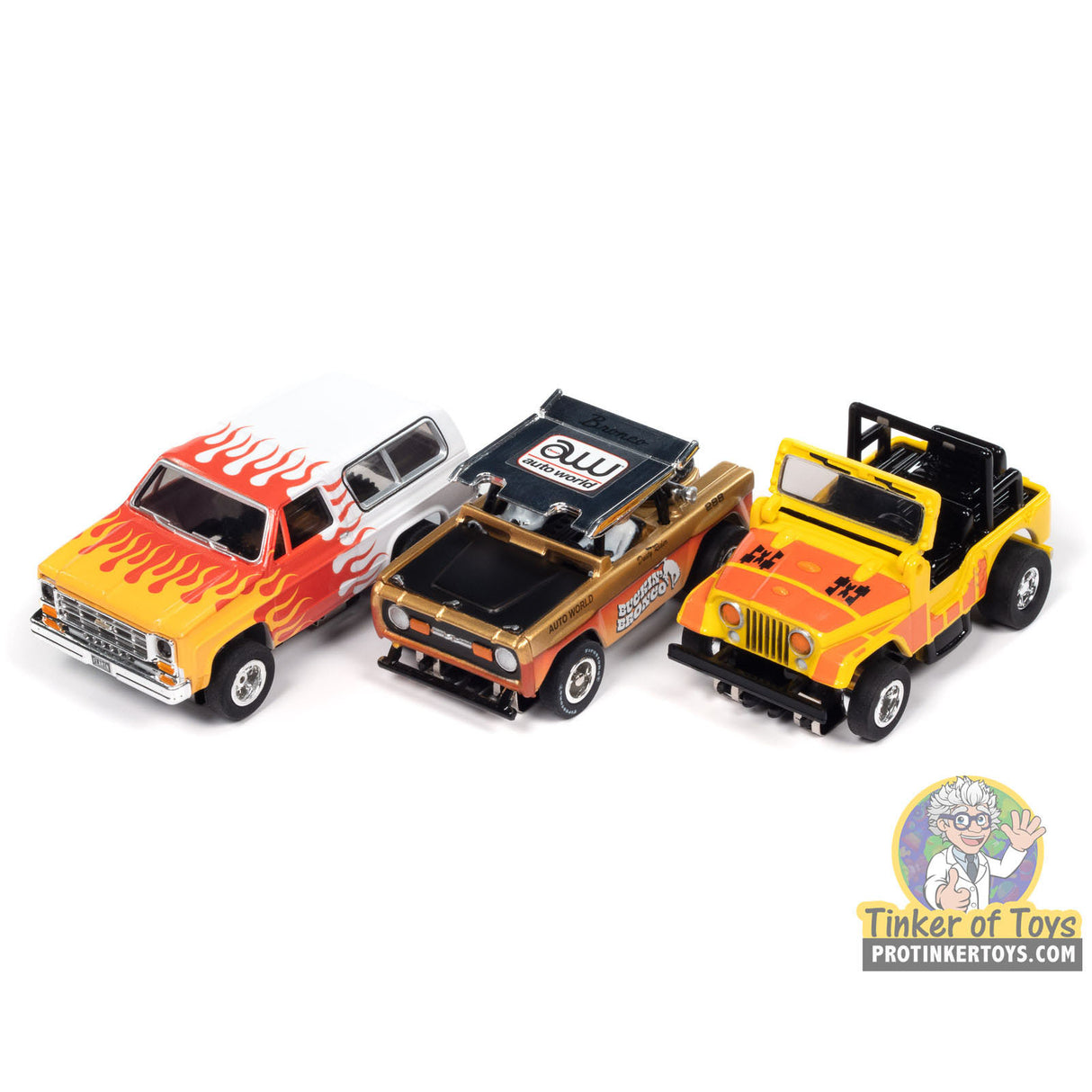 Xtraction R2 Off Road | SC407 | Auto World - 1 - 1972 Ford Baja Bronco - Gold w/ Orange Race Graphics - A is backordered and will ship as soon as it is back in stock.