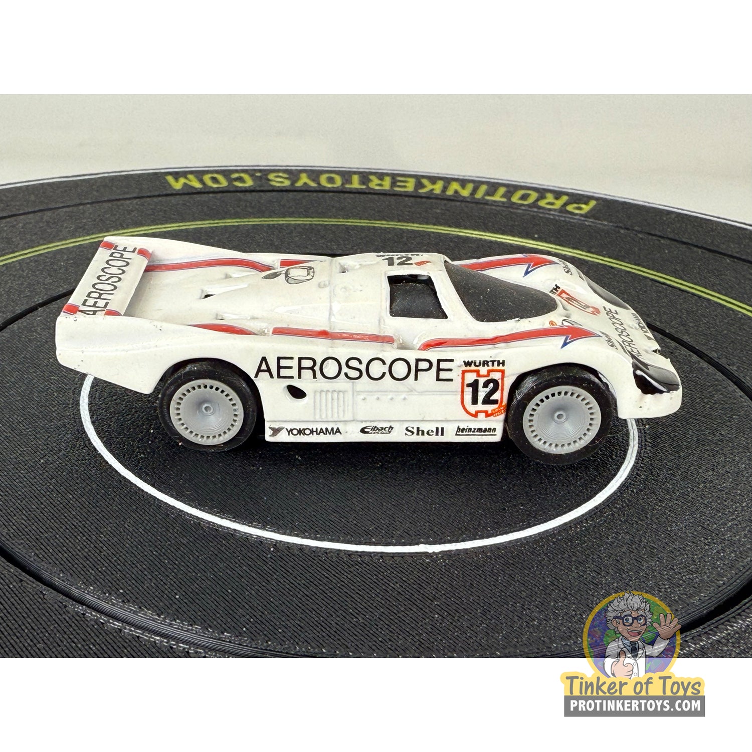 This stunning custom Porsche 962-style build features a sleek white "Aeroscope" livery with endurance racing-inspired decals. The body is mounted on a reliable Tyco 440x2 chassis for fast and smooth performance.