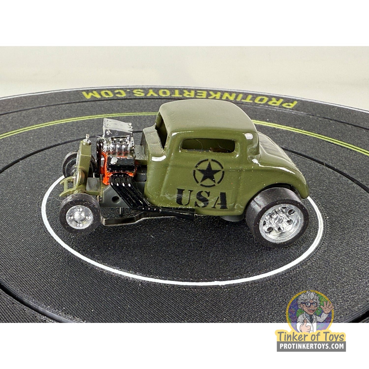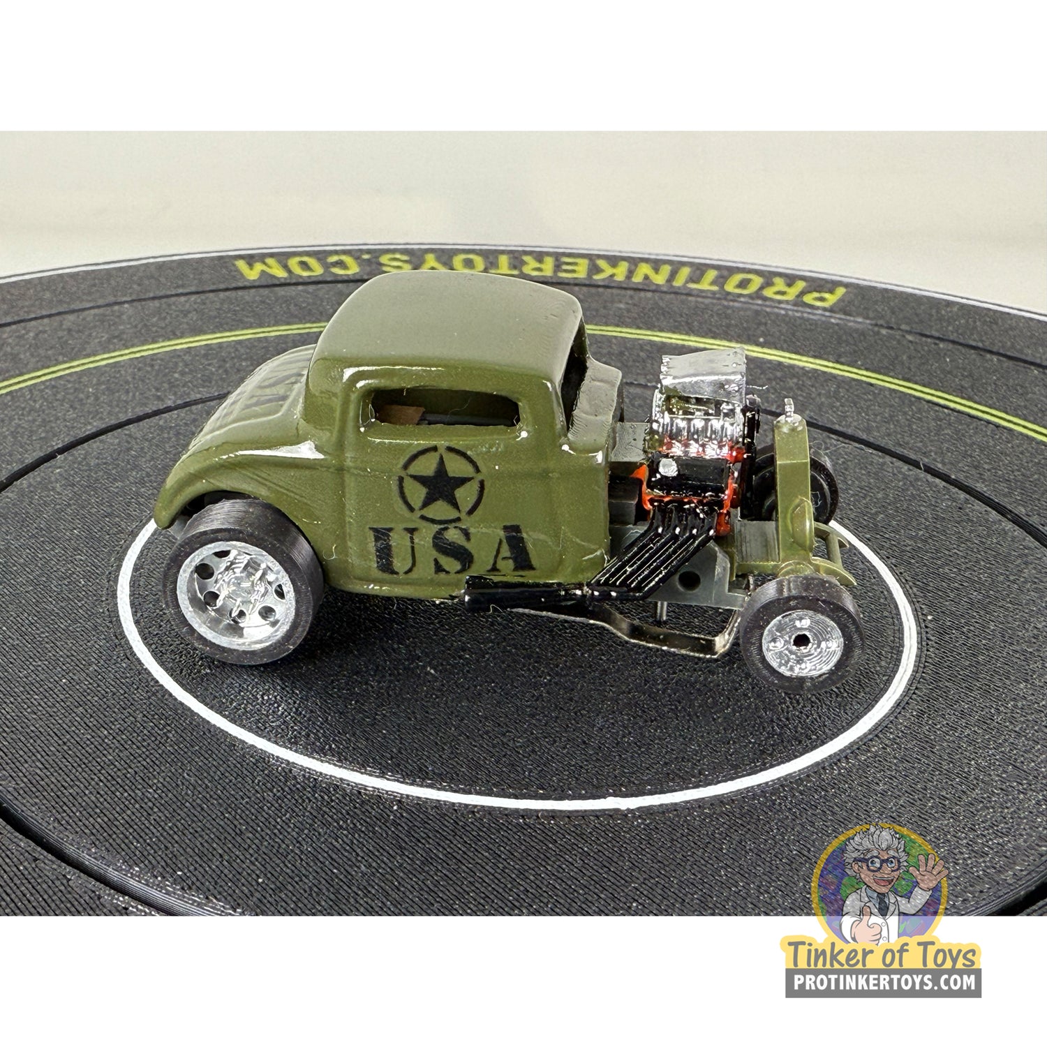 This military-themed 32 Coupe Hot Rod is finished in gloss olive green with black star insignia and “USA HQ1 101 AB-X” markings at the rear. It’s a clean, bold design that brings a rugged, service-inspired look to your custom slot car collection.