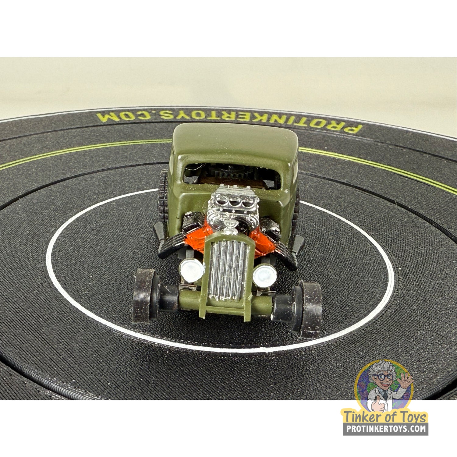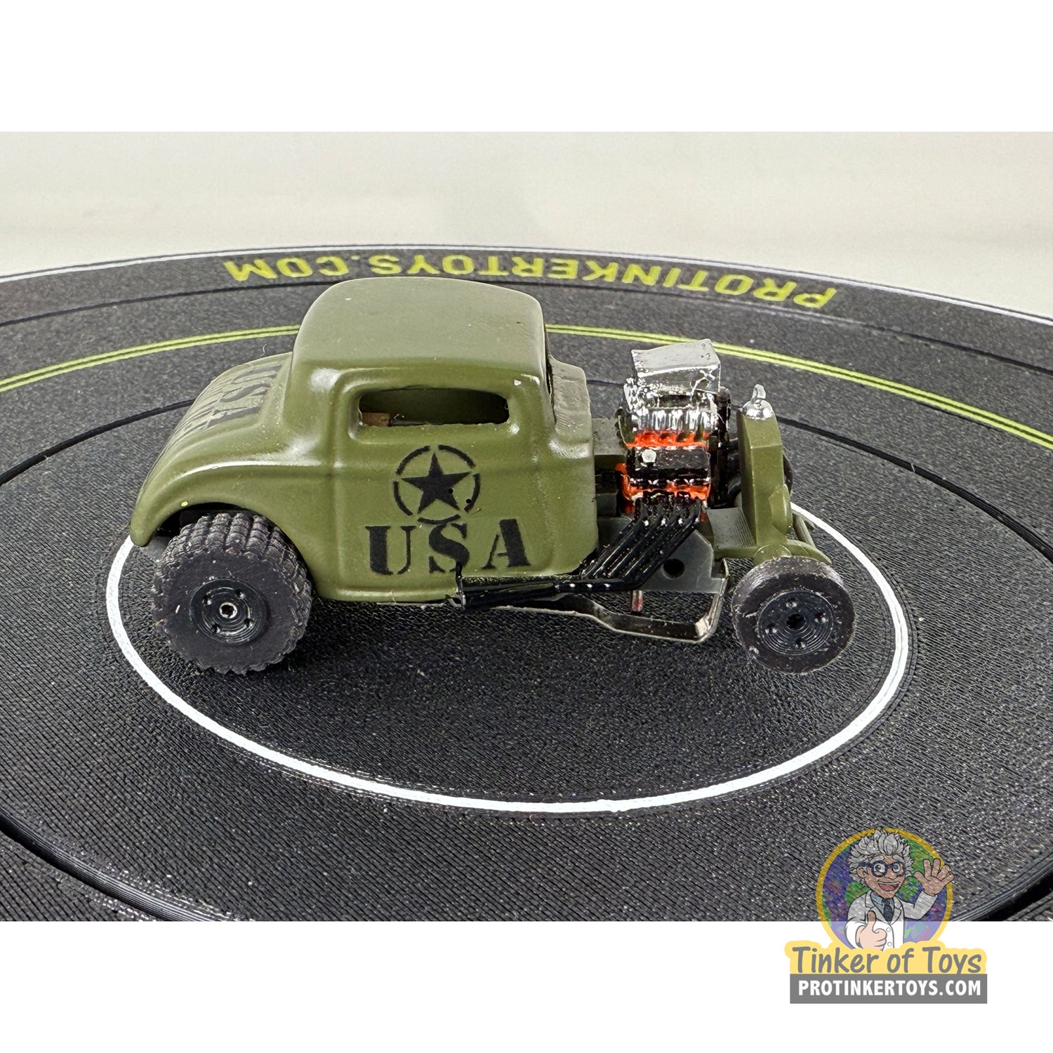This 32 Coupe Hot Rod features a clean military look with a matte olive green finish, black star insignia, and “USA HQ1” detailing at the rear. It offers a rugged, subdued presence that stands out in any custom slot car collection.