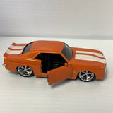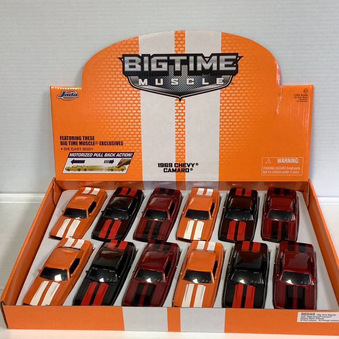Item# 96949 1969 Chevy Camaro by Jada is a die cast metal body 1:32 scale pull back action toy car with openable doors. Available in red, black and orange. Suitable for ages three years and up. Pull this Classic car replica back and let it zoom!