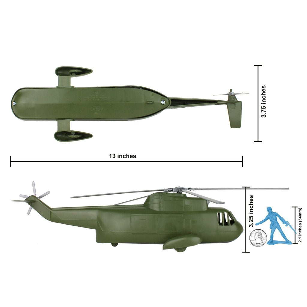 Air Extraction for your PLASTIC ARMY MEN has arrived. The Tim Mee Military Rescue 'Copter is once again proudly manufactured in the United States and available as this 26 piece set. Set includes an olive-green Sea King Helicopter, American flag with base, and 2 dozen cyan-blue M16 Soldier figures. The chopper is modeled after the Sikorsky SH-3 and features spinning main rotor and stationary landing wheels. The fuselage measures 13 inches long, 3.25 inches tall and 3.75 inches wide. The aircraft is made from slightly stiff olive-green color HDPE plastic and the soldiers are made from slightly flexible LDPE plastic, both have very little flashing. The helicopter is approximately 1:48 scale and the figures are 1:35 scale.