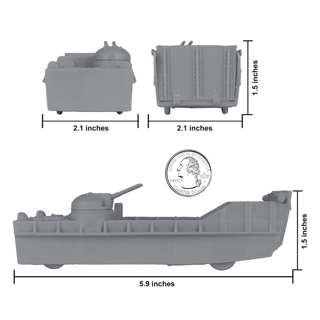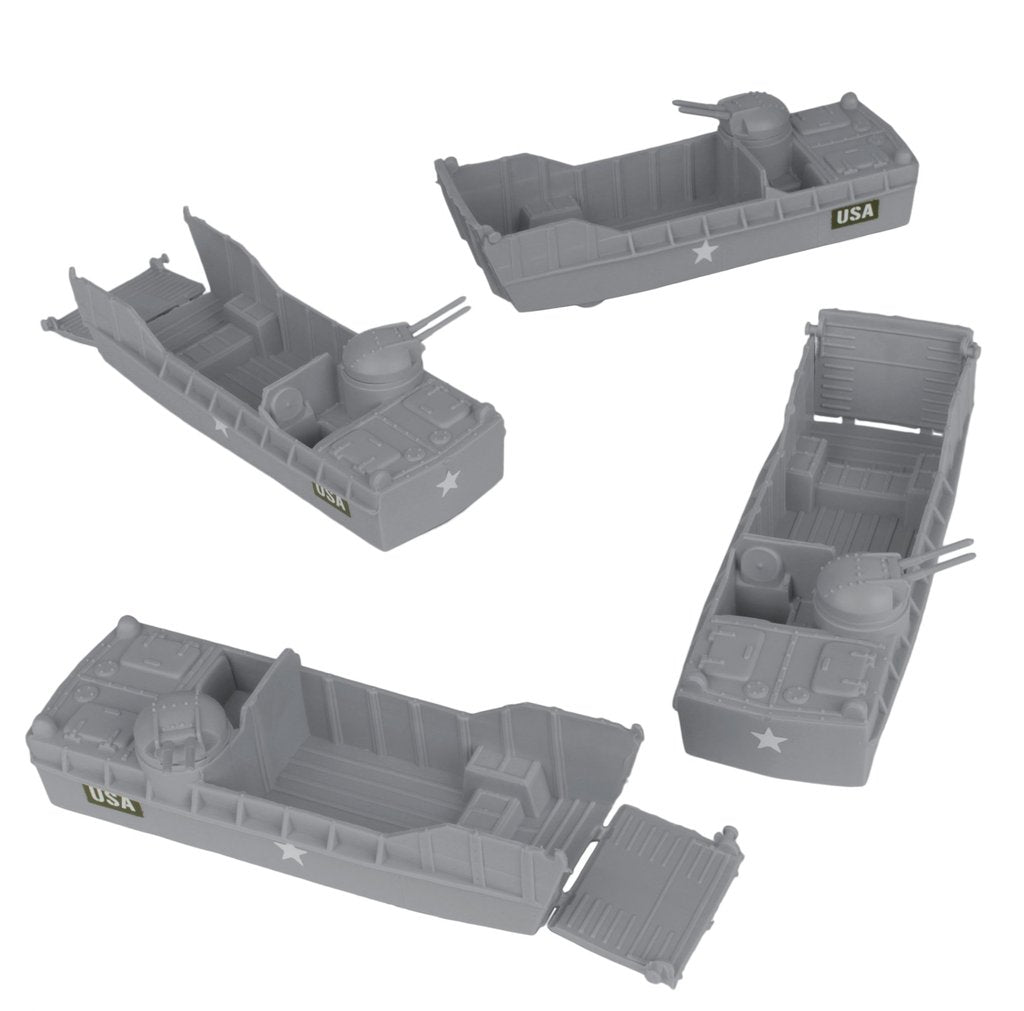 From the CLASSIC ARMY MEN COLLECTOR SERIES, BMC Toys brings back another American toy from yesteryear. This pack of 4 LCVP Higgins Boat type Landing Crafts are proudly manufactured in the United States. The set includes 4 gray vehicles. Each boat features a dual gun turret, ramp that opens and closes, and rolling wheels. The ramps, turrets and wheels may be fairly stiff to operate at first. Boats are approximately 1:72 scale, measures approximately 5.9 inches long, 2.1 inches wide, and 1.5 inches tall. Made from fairly stiff, polypropylene plastic with medium detail and some flashing.