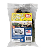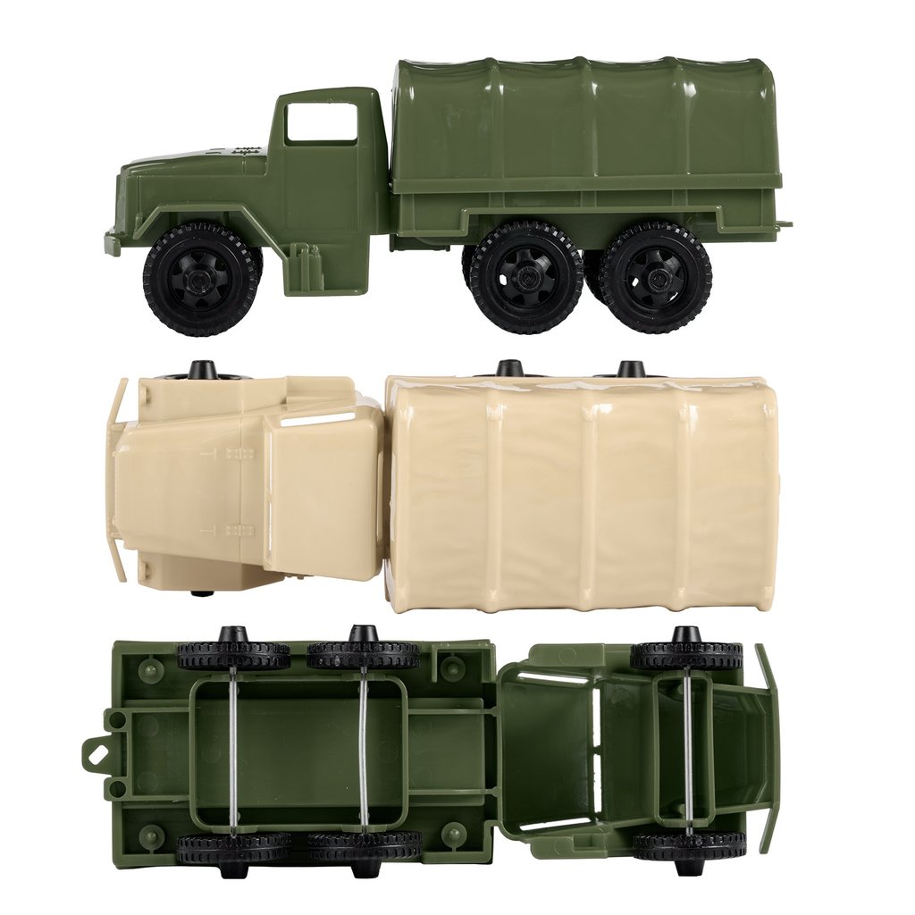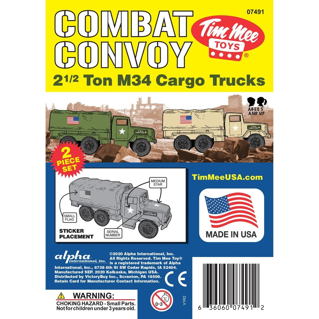 An American classic rides again. These Tim Mee Deuce-and-a-Half 2-1/2 Ton CARGO TRUCKS are proudly manufactured in the United States and available as this 2 piece set that includes 1 desert tan and 1 olive green vehicle. Trucks feature removable canvas cover and rolling wheels with real metal axles. Each truck is approximately 1:35 scale and measures 8 inches long. Made from slightly stiff HDPE plastic with medium detail and very little flashing.