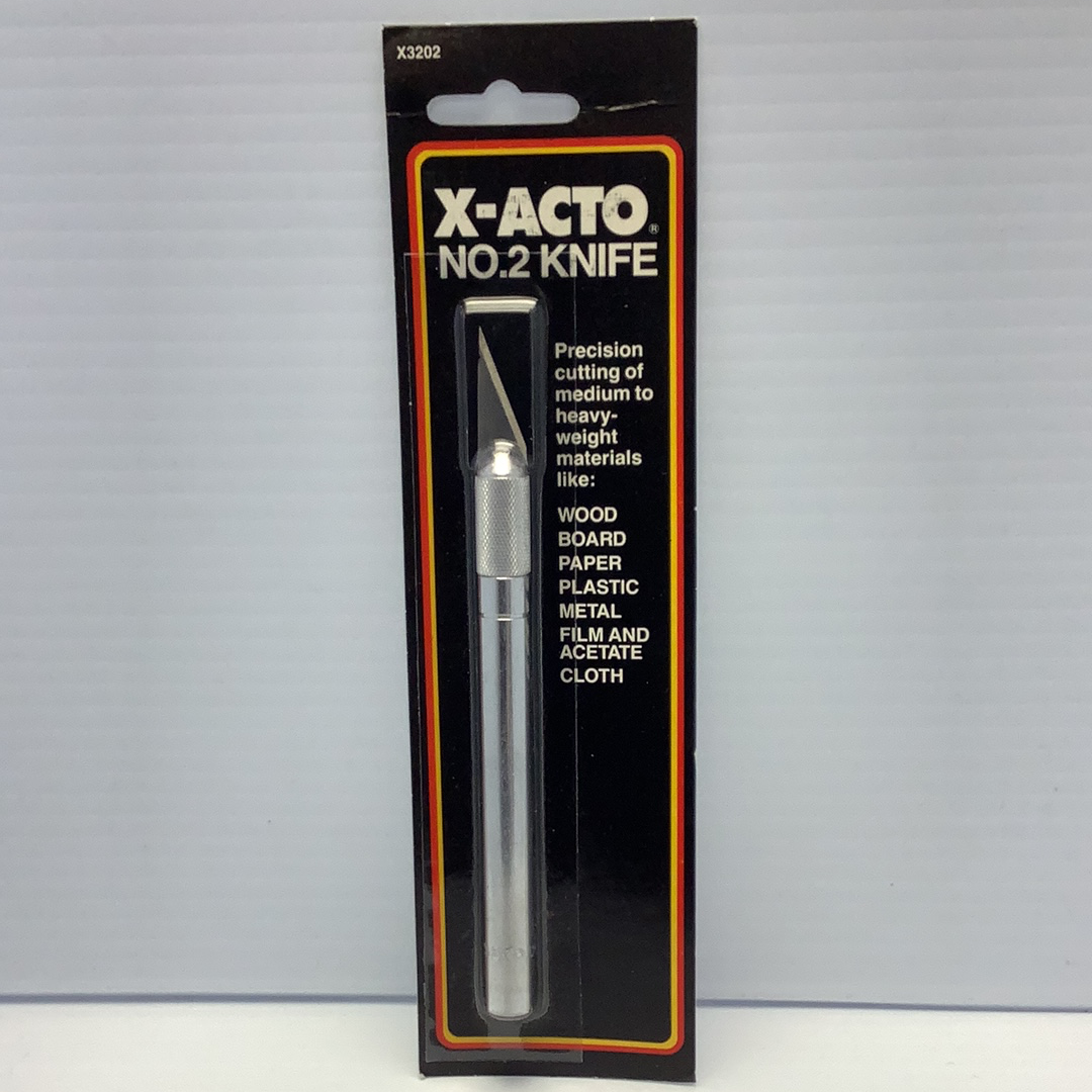 Item# X3202 No. 2 Knife by X-ACTO is a precision cutting of medium to heavy-weight materials like: wood, board, paper, plastic, metal, film and acetate, and cloth. The following X-Acto blades fits this knife: #15, #18, #19, #22, #23, #24, #25, #26, #27, and #28. Packaged in 1989 and made in U.S.A.