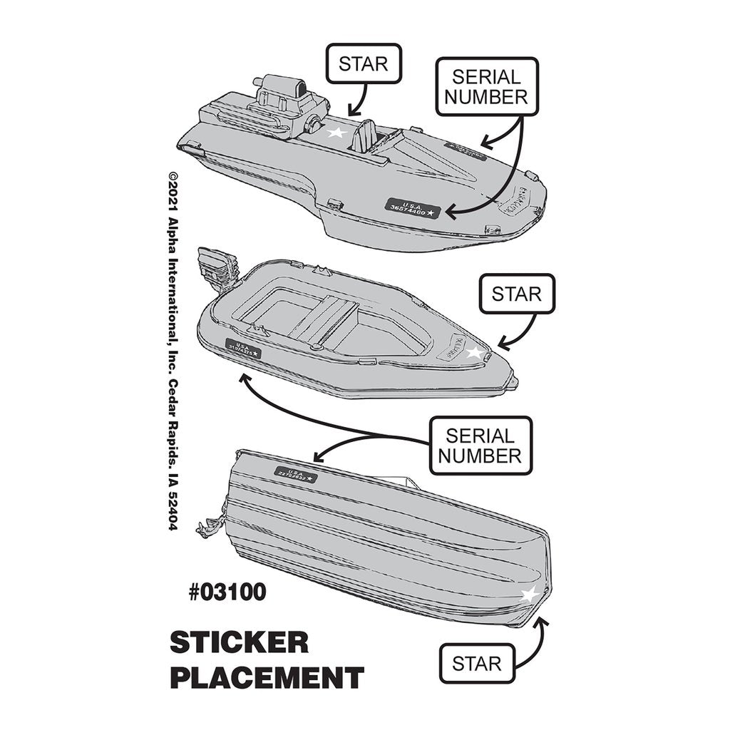 This set includes 3 different water craft, each with name molded on the bow. The DOLPHIN is modeled after a rubber boat with a nearly pointed bow and outboard motor. The BARRACUDA is hydrofoil racing boat with a hot-rod onboard motor. The SHARK resembles a Boston Whaler Skimmer with outboard motor and clear windshield. PROCESSED PLASTIC (Tim Mee's parent company) produced these boats for many decades starting around the 1960s. They were usually molded in red, white and blue and offered as bin toys. The Dolphin was sometimes included in a bagged set along with soldiers labeled 'Marine Beach Assault with Dinghy'. This set includes a special water resistant polypro sticker sheet with the classic Tim Mee stars and serial numbers.