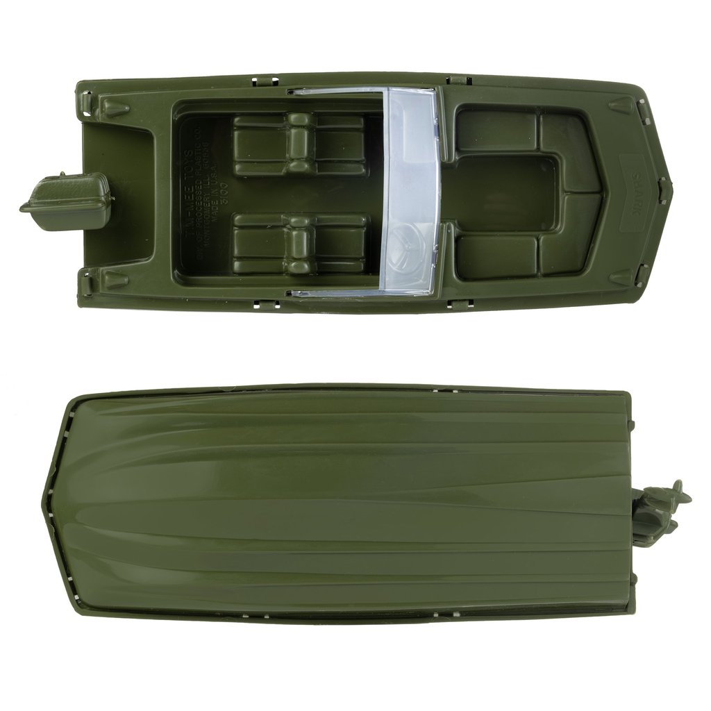 The Tim Mee PATROL BOATS are ready for the water! This #3100 three piece set is proudly manufactured in the United States. They float in water, measures about 7.5 inches long, and are approximately 1:24 scale. Made from slightly stiff olive green color HDPE plastic with very little flashing.