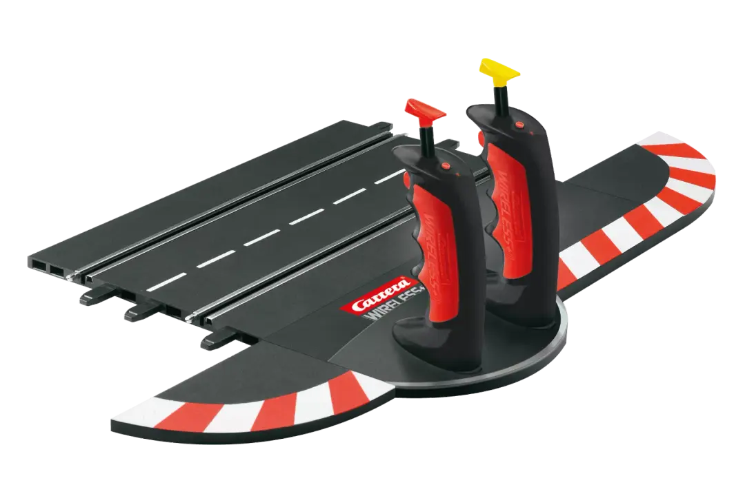 With the Carrera WIRELESS+ Set Duo Digital, you can get down to business on the race track without any mess or the old, familiar tangle of cables, and at the same time ensure more action and wireless race track fun. The speed controllers are designed for the Carrera DIGITAL 124 and Carrera DIGITAL 132 race tracks and can be attached directly to the Carrera race track thanks to their connecting track with double charging station. In addition to the added freedom of movement that the controllers give you, they also score points for their lightweight construction. They lie precisely in your hand and are easy to operate. The ideal conditions for an exciting and technically flawless race. With the 2.4 GHz WIRELESS+ radio technology, a range of up to 15 metres is possible and enables interference-free driving within the same environment for up to 6 drivers, all thanks to frequency hopping. All in all, the lithium polymer battery provides 8 hours playing time in continuous operation – a great advantage when you consider how fast time flies during wild racing duels. The set includes the two Carrera 2.4 GHz WIRELESS+ speed controllers, a 2.4 GHz WIRELESS+ receiver, a 2.4 GHz WIRELESS+ dual charging station, an adapter unit, as well as a shoulder complement and end section for the outside curb – all ready for racing action and immediate use.